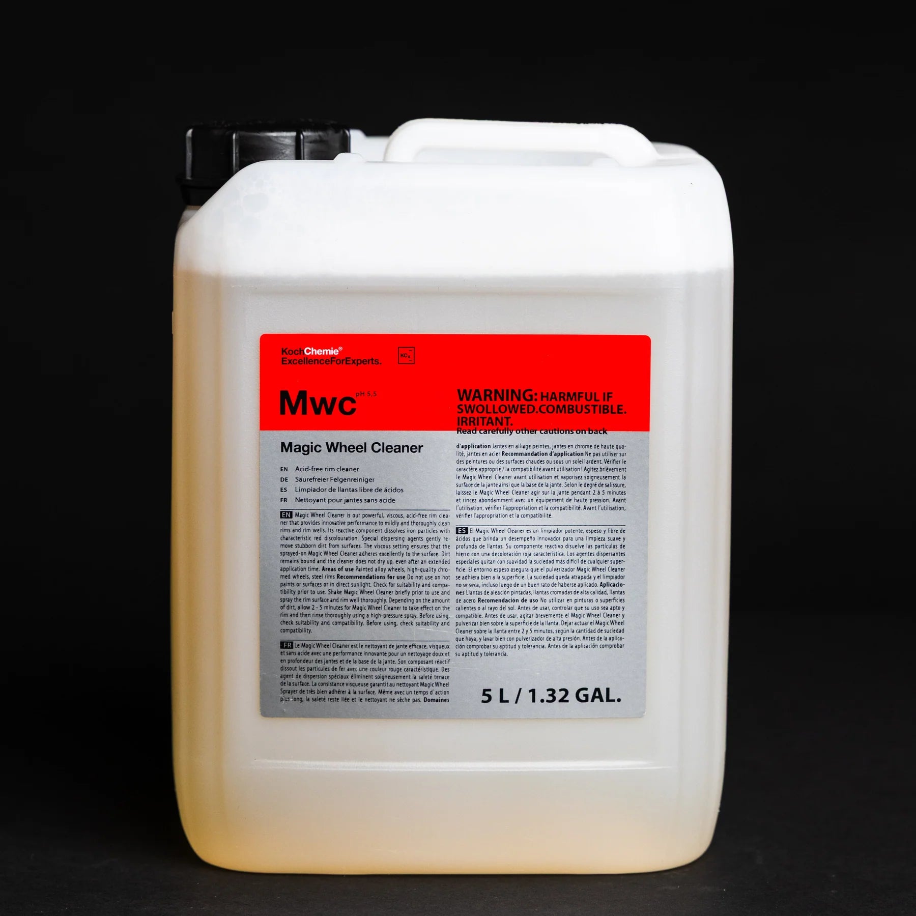 Magic Wheel Cleaner is our powerful, viscous, acid-free rim cleaner that provides innovative performance to mildly and thoroughly clean rims and rim wells. Its reactive component dissolves iron particles with characteristic red discolouration. Special dispersing agents gently remove stubborn dirt from surfaces. The viscous setting ensures that the sprayed-on Magic Wheel Cleaner adheres excellently to the surface. Dirt remains bound and the cleaner does not dry up, even after an extended application time.